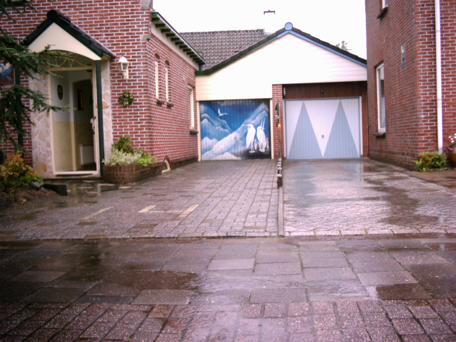 Over deze gedeelde garage is door een fout,een puntdak verkeerd gesitueerd.