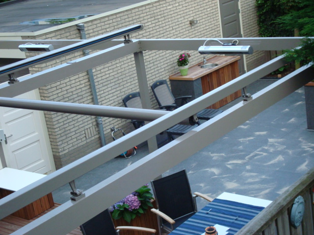 De buren hebben een zeer groot open ijzeren constructie (over de helft van de tuin in de diepte en over de gehele breedte van de tuin tot de mandelige schutting) geplaatst met een automatische overkapping/zonne-Luifel eroverheen. (zie foto, hierbij is de zonne-luifel niet opengeschoven).