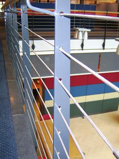 Nu zag ik laatst ergens een trap (in een centrale hal) waar de leuning bestond uit staalkabels (zie foto).