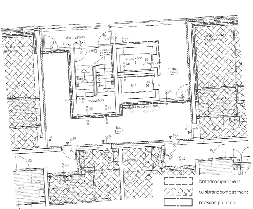 - dient de scheiding tussen lifthal en hal 30 minuten te zijn, of mag dat '0' zijn? De vraag is dus, anders gezegd, of de hal en de lifthal twee brandwerend van elkaar gescheiden ruimtes dienen te zijn. Of mag deze scheiding niet brandwerend zijn? Indien dat laatste het geval is, dient de liftdeur van de 'gewone lift' wel 60 minuten ipv 30 te zijn, alsook zelfsluitend denk ik? De reden dat de scheiding tussen hal en lifthal als 30 minuten is aangegeven op de afbeelding is dat het de rookcompartimentsscheiding is. De hamvraag voor dit hele verhaal is denk ik: kan de rookcompartimentsscheiding anders (slimmer) worden gelegd waardoor de wand tussen lifthal en hal niet meer brandwerend hoeft te zijn?