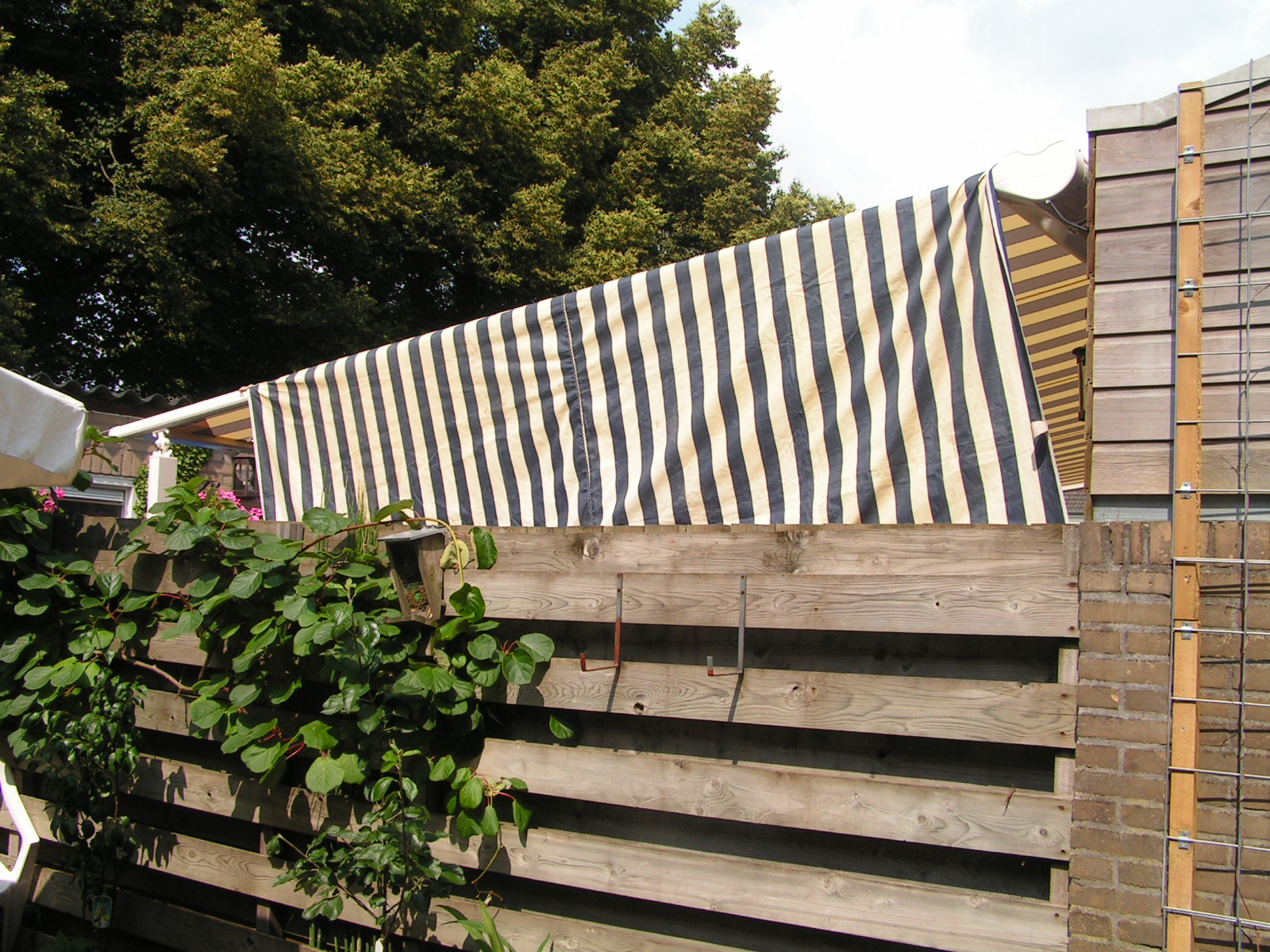 De schutting is 180 hoog en op die hoogte moesten ze blijven van de woningschichting en de gemeente.maar wat ik al aangeef dat ze nu wel een doek plaatsen op die hoogte wat met de planken niet mocht. een parasol wordt normaal als de zon niet meer schijnt in geklapt ,die doek blijft bij hun hangen ,en wat de privacy betreft op hun perceel is voldoende wij kunnen hun niet zien als ik in de tuin zit .