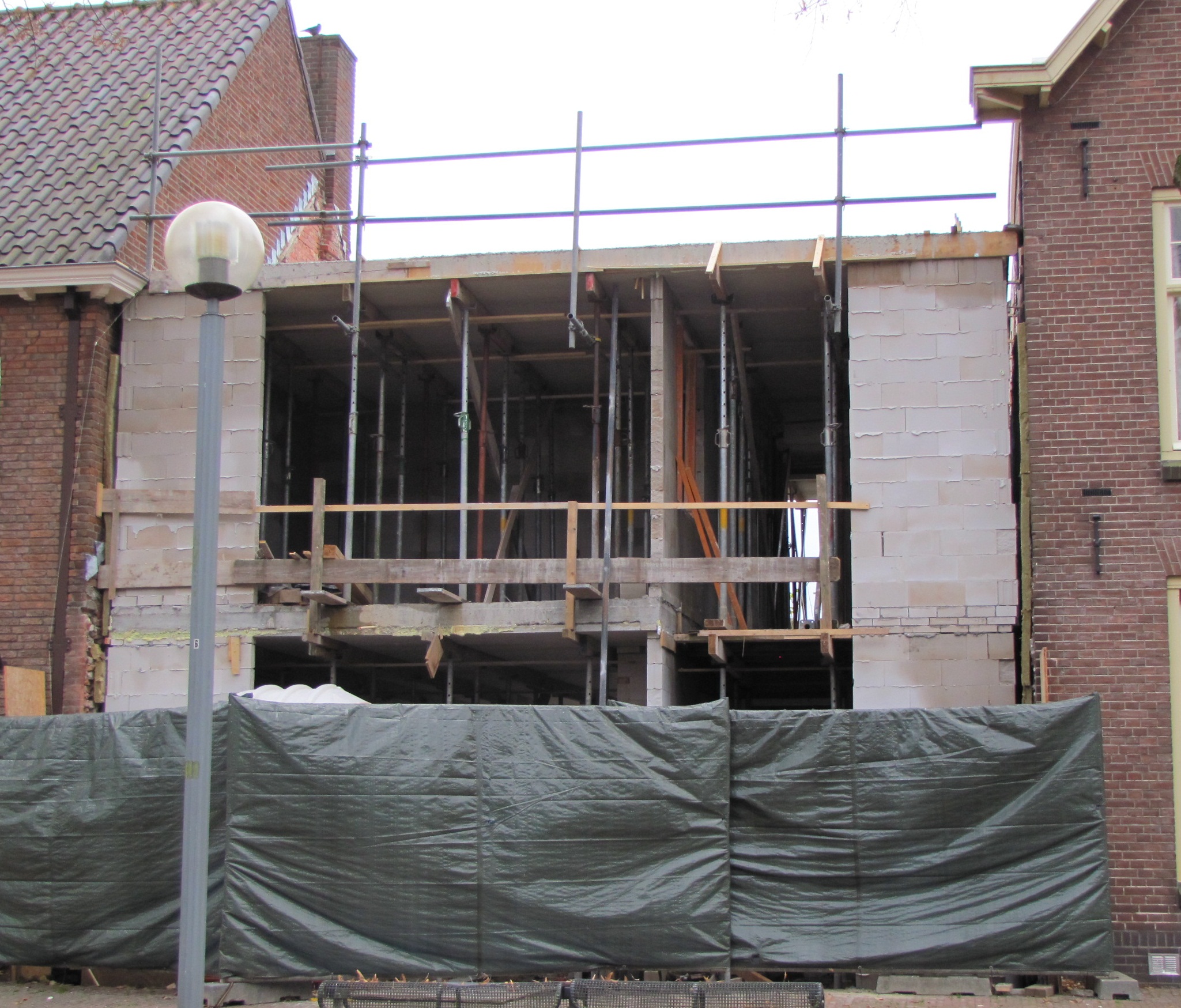 Tussen 2 oude woningen wordt een nieuwe gebouwd. Vreemd vond ik dat de isolatie tegen de oude (ongeisoleerde?) woningen is gezet, i.p.v. aan de verwarmde zijde van de nieuwe woning. Tenminste... daar lijkt het heel erg op.