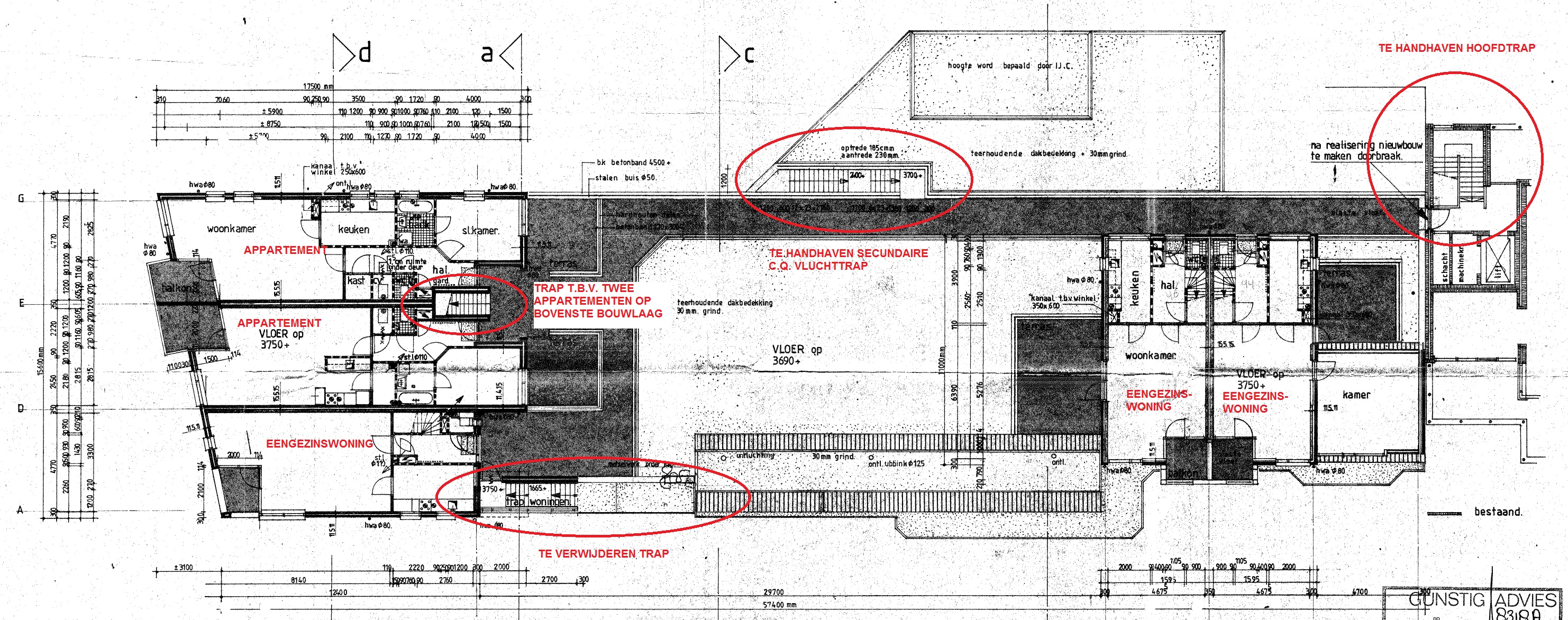 Alleen ditmaal met een bijlage, te weten de plattegrond inclusief de nodige opmerkingen. Algemene vraagstelling: mag ik de trap onder aan de tekening verwijderen? Of gaat dit dan mis met de vluchtwegen?