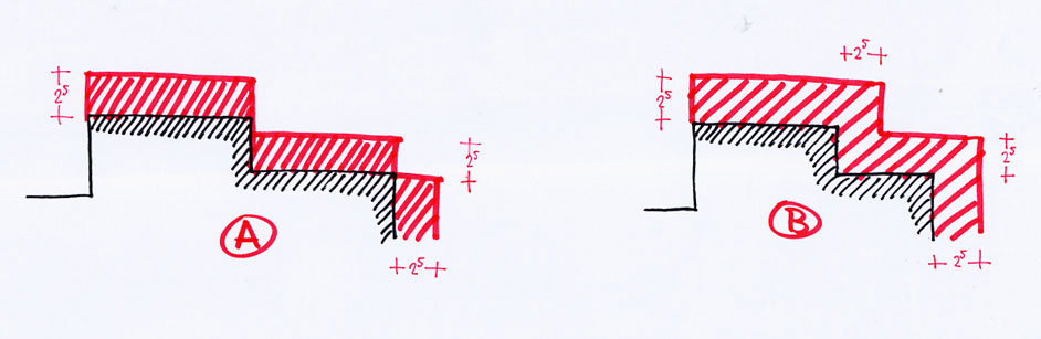 Op dit moment ben ik bezig met het maken van een ontwerp waarbij er aan een verspringende (achter)gevel een uitbouw moet komen. Nu verspringt de 2,5m. zone met de verspringing in de gevel, echter op welke wijze (zie schets); A of B?