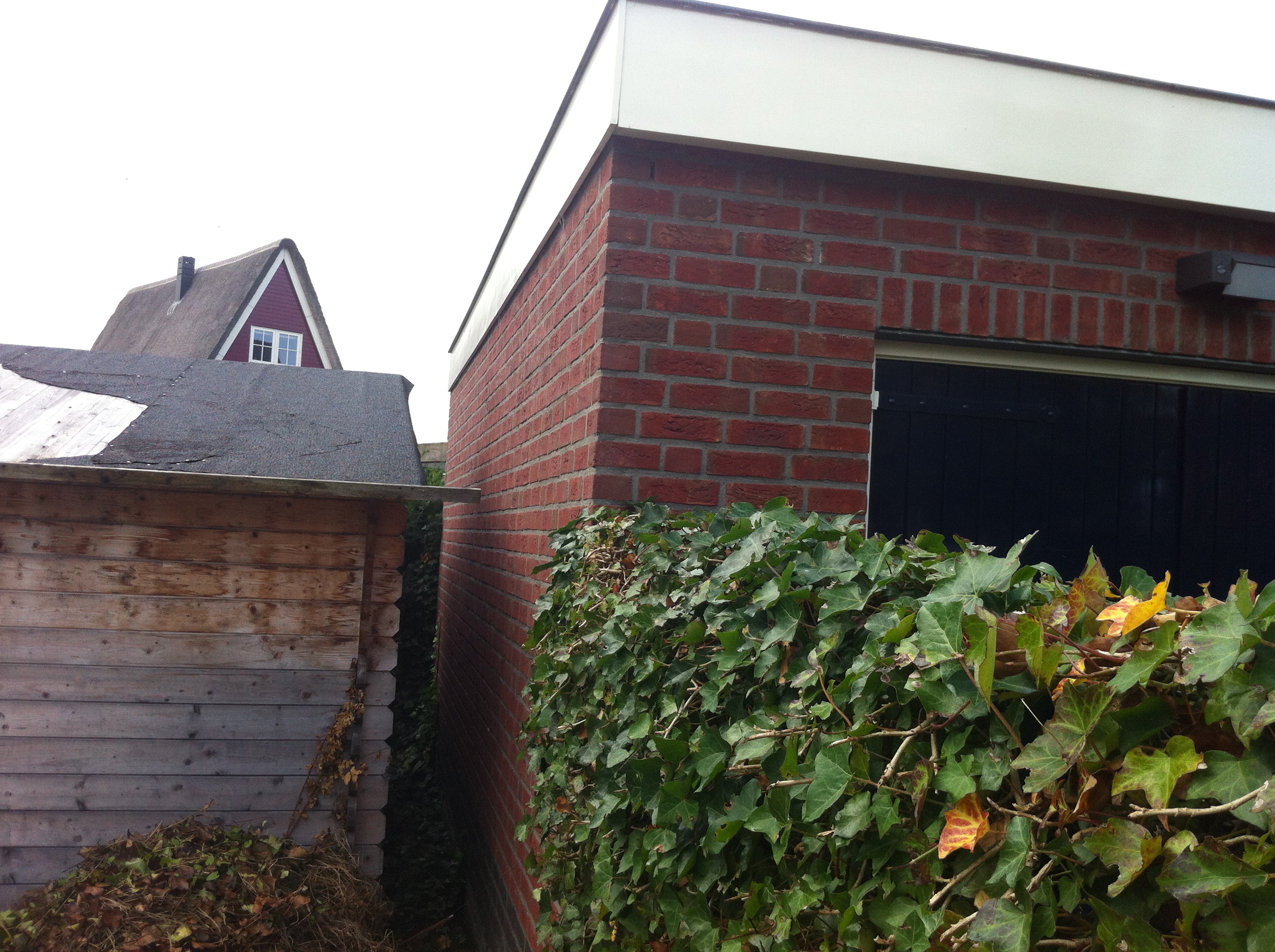 Er wordt aangeraden door verschillende aannemers om de nieuwe garage direct tegen die van ons te plaatsen. Dan blijven beide muren in betere staat en kom er geen vocht en vuil tussen. Het dak wordt dan aan elkaar gemaakt met regen afvoer.