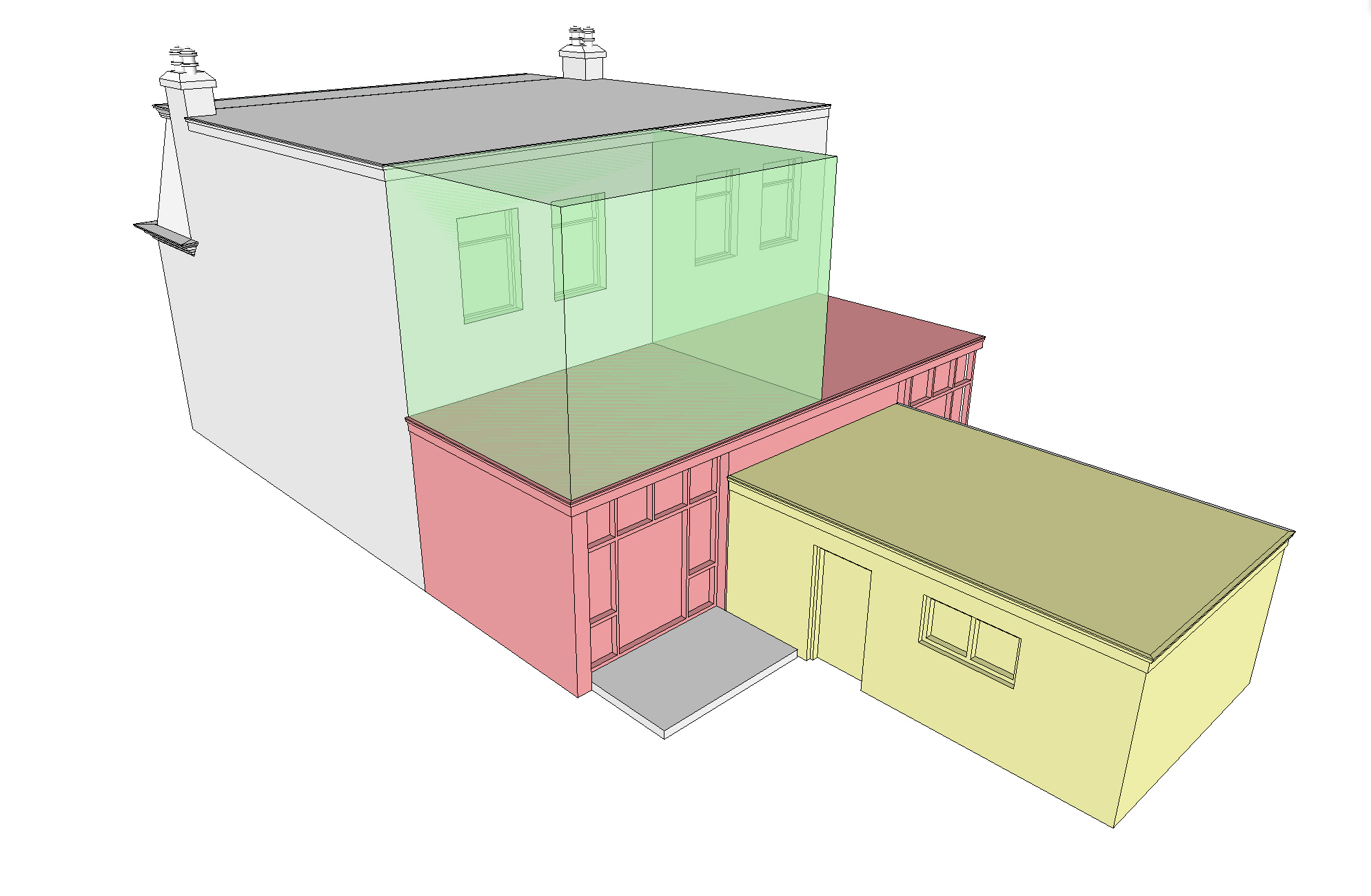 In de bijlage een 3d model van een particuliere woning. Het gaat om een blok van meerdere woningen. Er zijn twee woningen afgebeeld. De woning waar je tegenaan kijkt in de afbeelding is de hoekwoning. Je kijkt tegen de zijgevel en de achtergevel aan. Het witte gedeelte is de oorspronkelijke bouw uit 1903. Het rode gedeelte is een aanbouw uit de jaren 80. Het gele gedeelte is een aanbouw die samen met de oorspronkelijke bouw uit 1903 is gerealiseerd. Deze loopt dus onder het rode gedeelte door tot tegen het witte gedeelte.