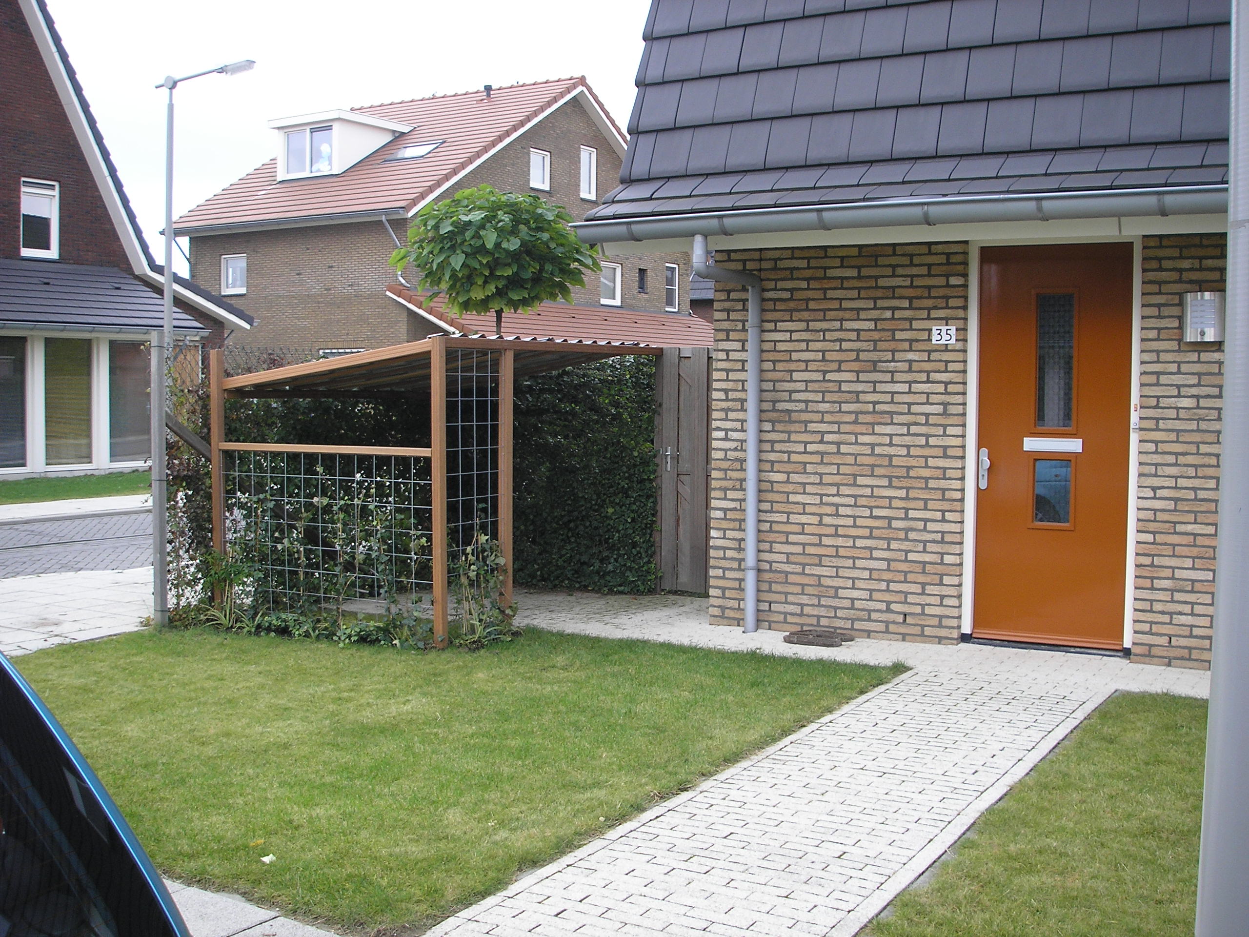 De 2 zijden stonden er al. We hebben alleen een afdak erop geplaatst en 2 stukken gaas met klimop erbij gezet.