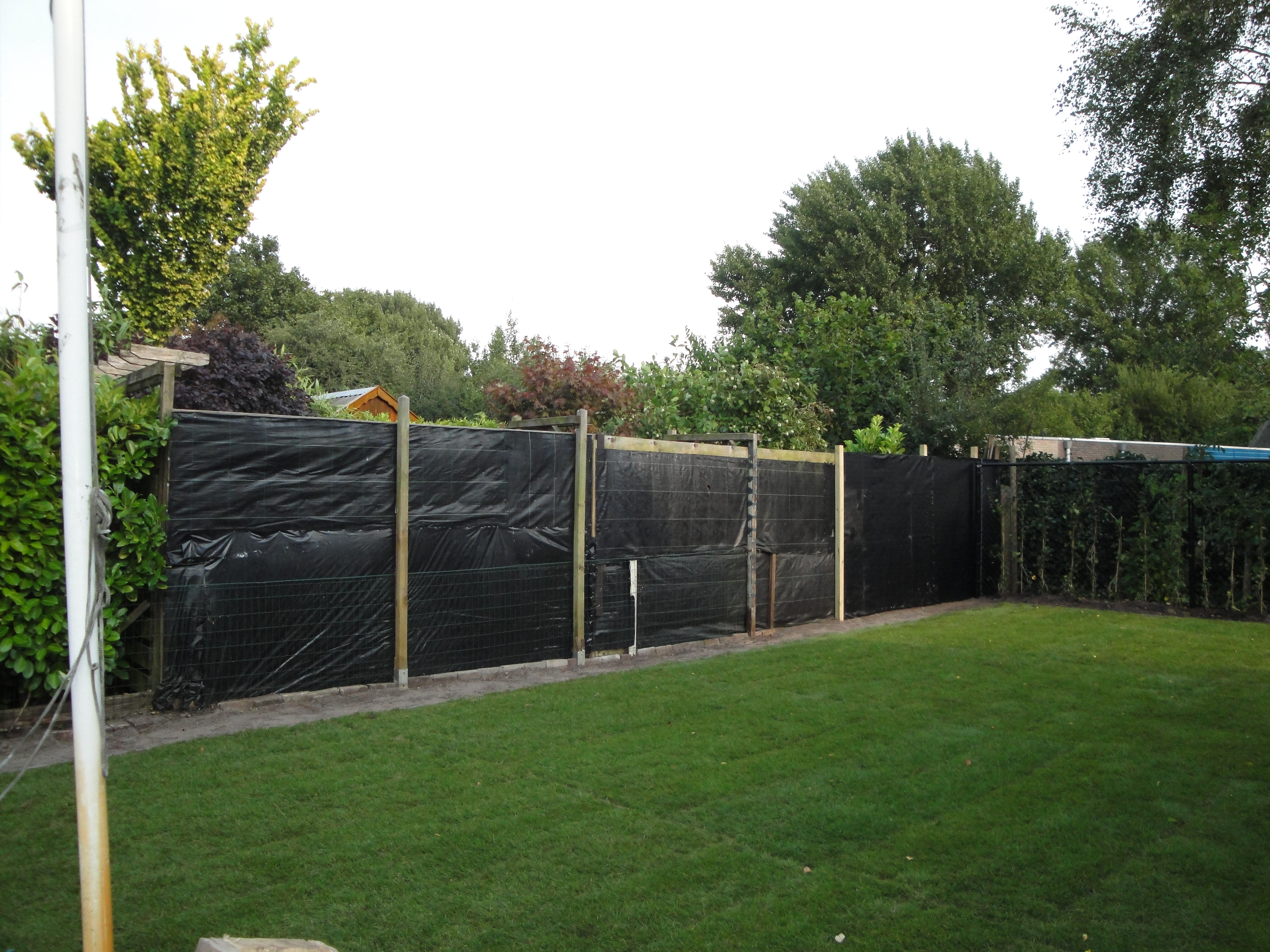 Onze buren hebben hun schutting aan onze zijde bekleed met zwart worteldoek.