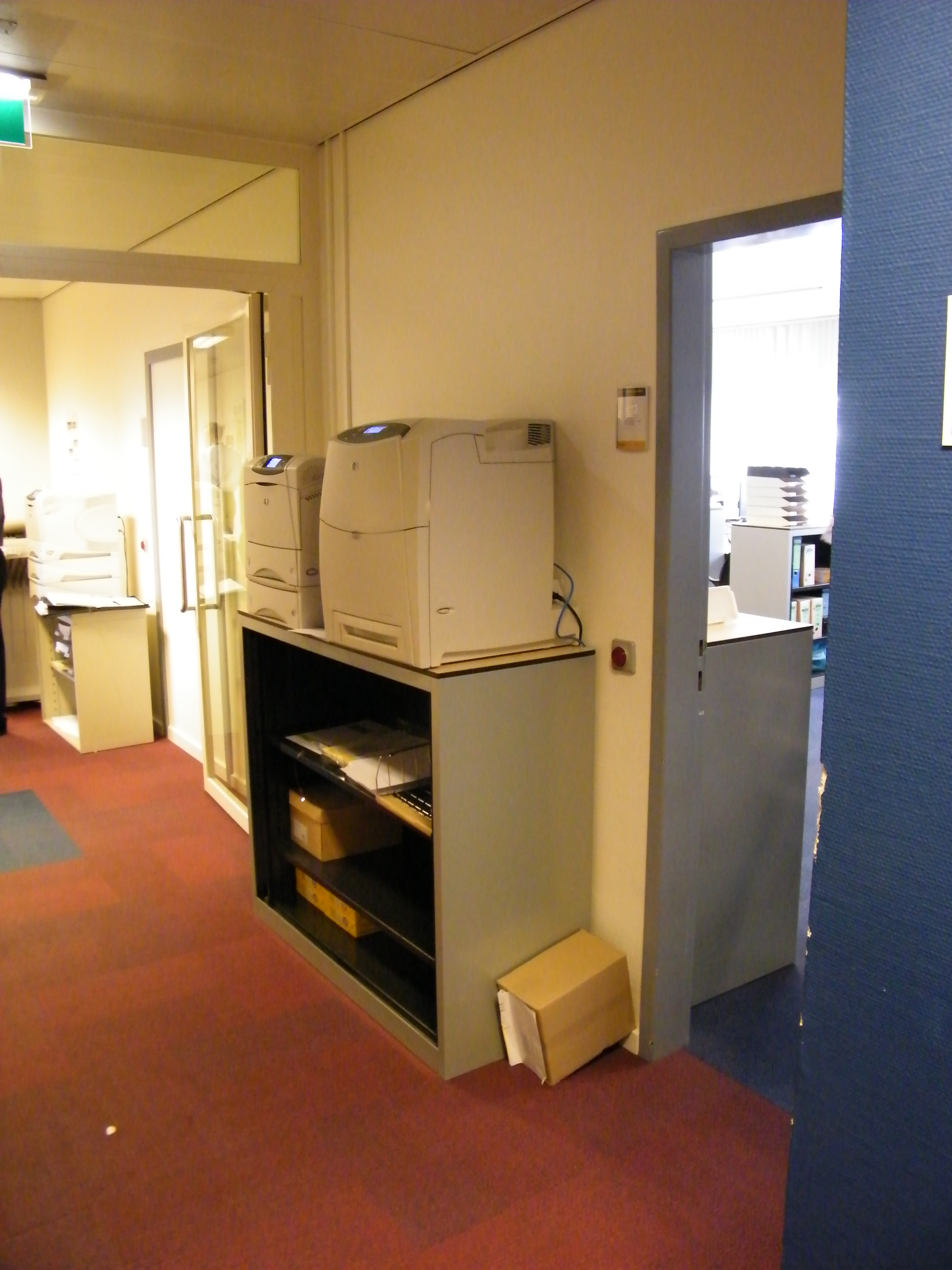 Zo op het oog is er meer dan voldoende vluchtruimte langs het kopieerapparaat, zoveel mensen zullen hier niet langs hoeven te vluchten. Of wel? Uiteraard hoe minder obstakels in een vluchtroute hoe beter.