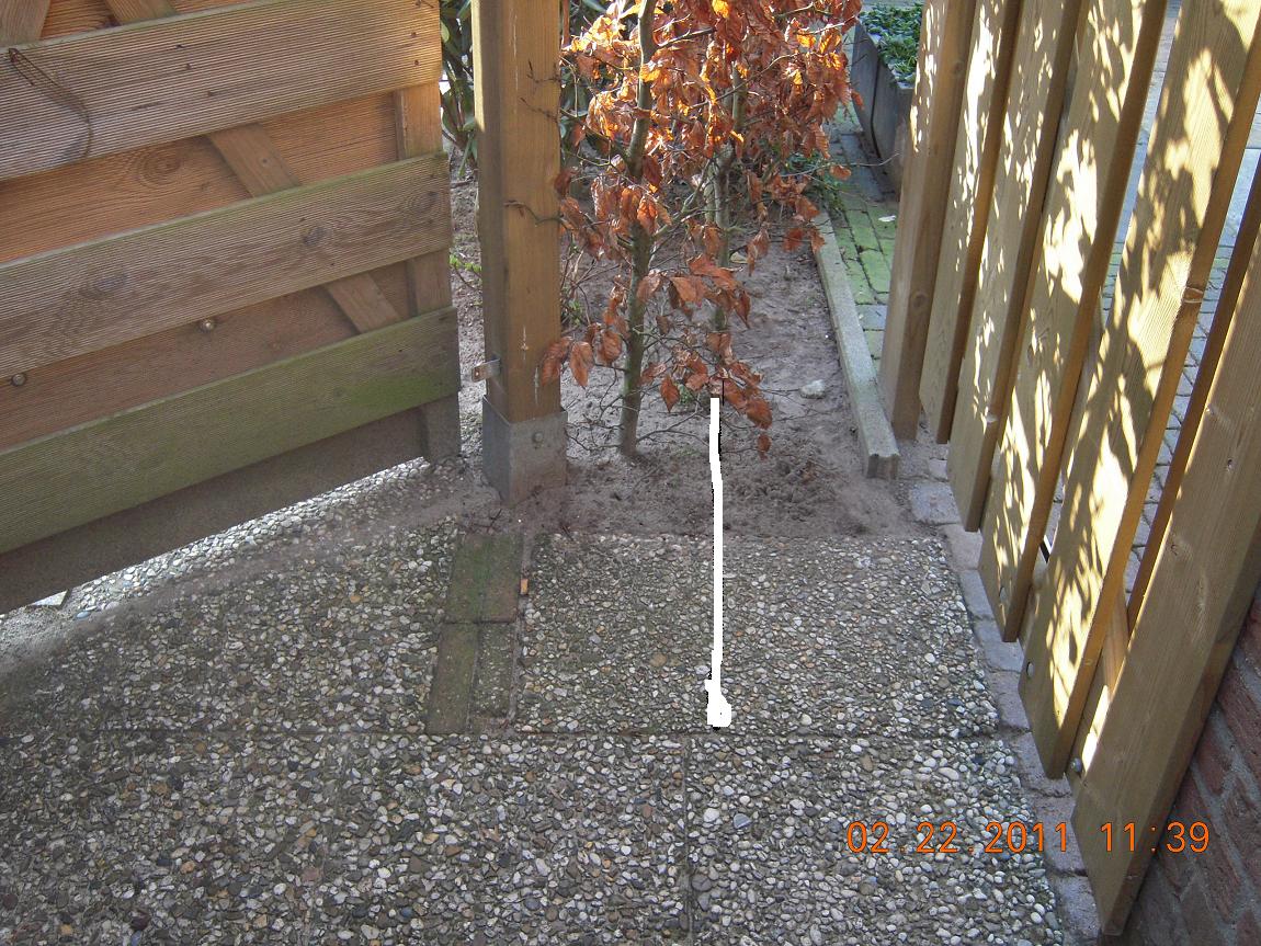 Bijgevoegd een schets en 1 foto. Op deze is te zien hoe zij gebruik gemaakt hebben van onze grond om o.a. een tegel te leggen van 0,60 cm,