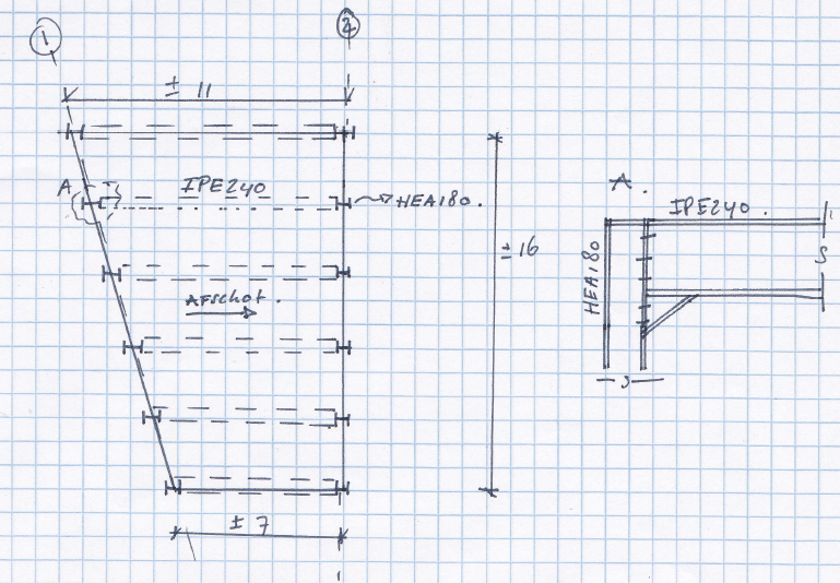 Ik zit al een tijdje met een aantal vragen in mijn hoofd omtrent een oud project wat wij ooit op stage hebben gehad (ik heb het zelf nooit behandeld maar ben toch benieuwd hoe dit opgelost kan worden). Het betreft een hal opgebouwd uit stalen elementen. Het bijzondere aan de hal was echter het feit dat de plattegrond aan ??n zijde schuin wegliep (zie de tekening bijgevoegd).