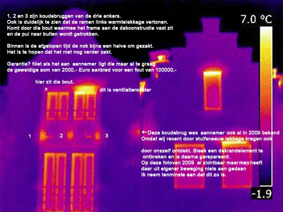 Onze eengezinswoning bevat een verborgen gebrek. Tijdens de productie van het prefab binnenblad en vloeren zijn montage-elementen niet ge?mplementeerd waardoor het frame niet kon worden gemonteerd volgens de voorschriften van de constructeur. In dec. 2008 werd een staal sierframe gemonteerd in het buitenblad. Van de 6 ankers heeft men er op de bouwplaats 3 afgezaagd, de vakkundig gemetselde pui uitgehakt t.b.v. twee nieuw bedachte ankers en aan de bovenzijde een gat geboord. Het frame is zeer zwaar, zit voor de hout kozijnen op eerste en tweede verdieping en vormt koudebruggen. Achter het frame ligt de pui voor weer en wind open. Oplevering was in jan. 2009, rond de oplevering heeft het betrokken ingenieursbureau thermografische foto's en analyse, alsmede een advies op basis NEN-EN 13187 van onze pui gemaakt welke ik recent op internet heb gevonden als illustratie bij een artikel over thermische fouten bij nieuwbouw. Van onze pui zijn geen tekeningen en details aangeleverd in de bouwvergunning, inzage in de tekeningen is ons door de aannemer geweigerd. Bouw en woningtoezicht hebben, zo staat in het bouwverslag, met de aannemer afgesproken niet tijdens de bouw te inspecteren maar alles ongezien wel goedgekeurd ofschoon zij op de hoogte waren met dit probleem. Volgens mij mag een staalframe niet worden aangepast maar moet worden gemonteerd zoals het is aangeleverd. Het frame is verbindingselement geworden door de montagewijzigingen van buitenblad, binnenblad, vloer 2e verdieping en dakconstructie. Aan de onderzijde aan het buitenblad, iets hoger aan het binnenblad, in de afwerkvloer van de kanaalplaatvloer van de tweede verdieping met onduidelijke montagemiddelen en aan de bovenzijde links door middel van een bout waarvoor een gat in het frame is geboord en waardoor het binnenblad iets naar buiten wijkt en de nok van het dak aan die zijde 1 cm naar beneden is getrokken. Bij regenbuien hebben we lekkage. Onze voorpui b.g. blijft lang nat en is begroeid met mossen. Volgens de architect moet het sierframe vrijhangend zijn t.b.v. de ventilatie voor de achterliggende hout kozijnen. De aannemer heeft een simpele oplossing om regenwater te keren want die wil het frame van ca. 5 mtr. hoog en bija 3 mtr. breed voorzien van kit en compriband waardoor de kozijnen naar verwachting zullen gaan rotten. Wij zijn hier al bijna 4 jaar mee bezig en het lijkt er op dat alle beschikbare instanties maar 1 doel hebben, 'een tevreden aannemer'.