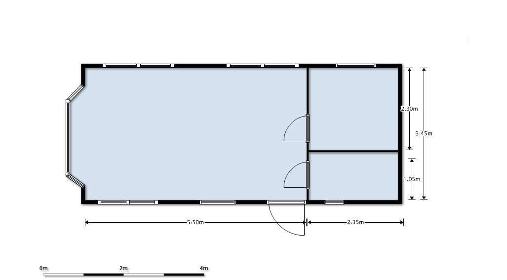 De wagen beschikt over 1 woonkamer/keuken 5,50 x 3,45 x 2,2 over 1 slaapkamer 2,4 x 2,35 x 2,2 en wc/douche 2,4 x 1,05 x 2,2