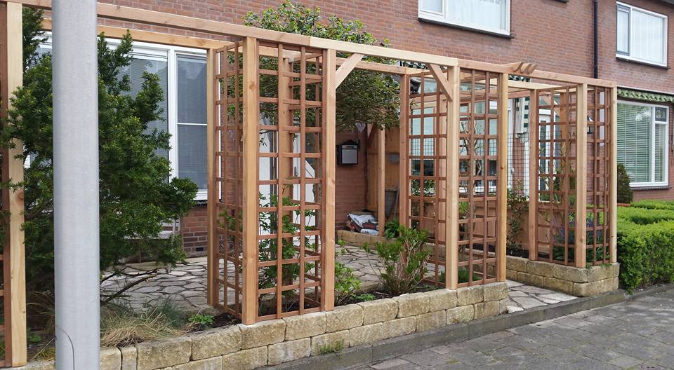 Het heeft idd de vorm van een pergola maar door de massa kun je het zien als een erfafscheiding, en dat in de voortuin.