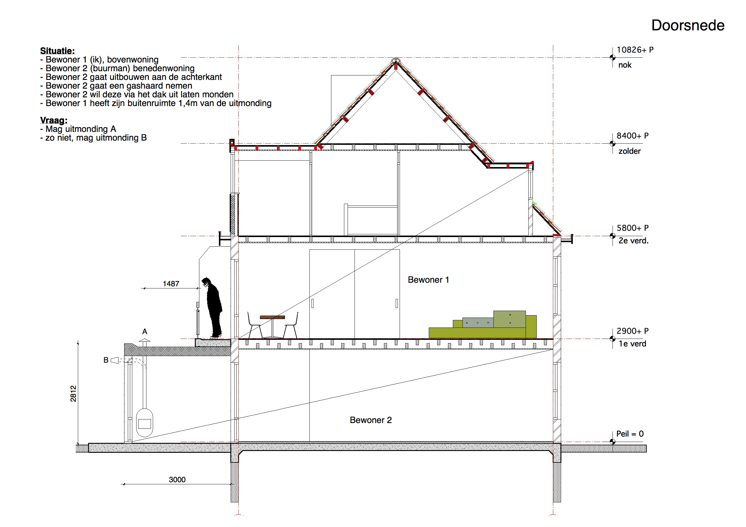 wij zijn bewoners van een bovenwoning en onze onderbuurman wil een uitbouw (zie bijlage). Nu wil hij een gashaard plaatsen met een dakuitvoer. Deze komt 1,4m van ons balkon af.