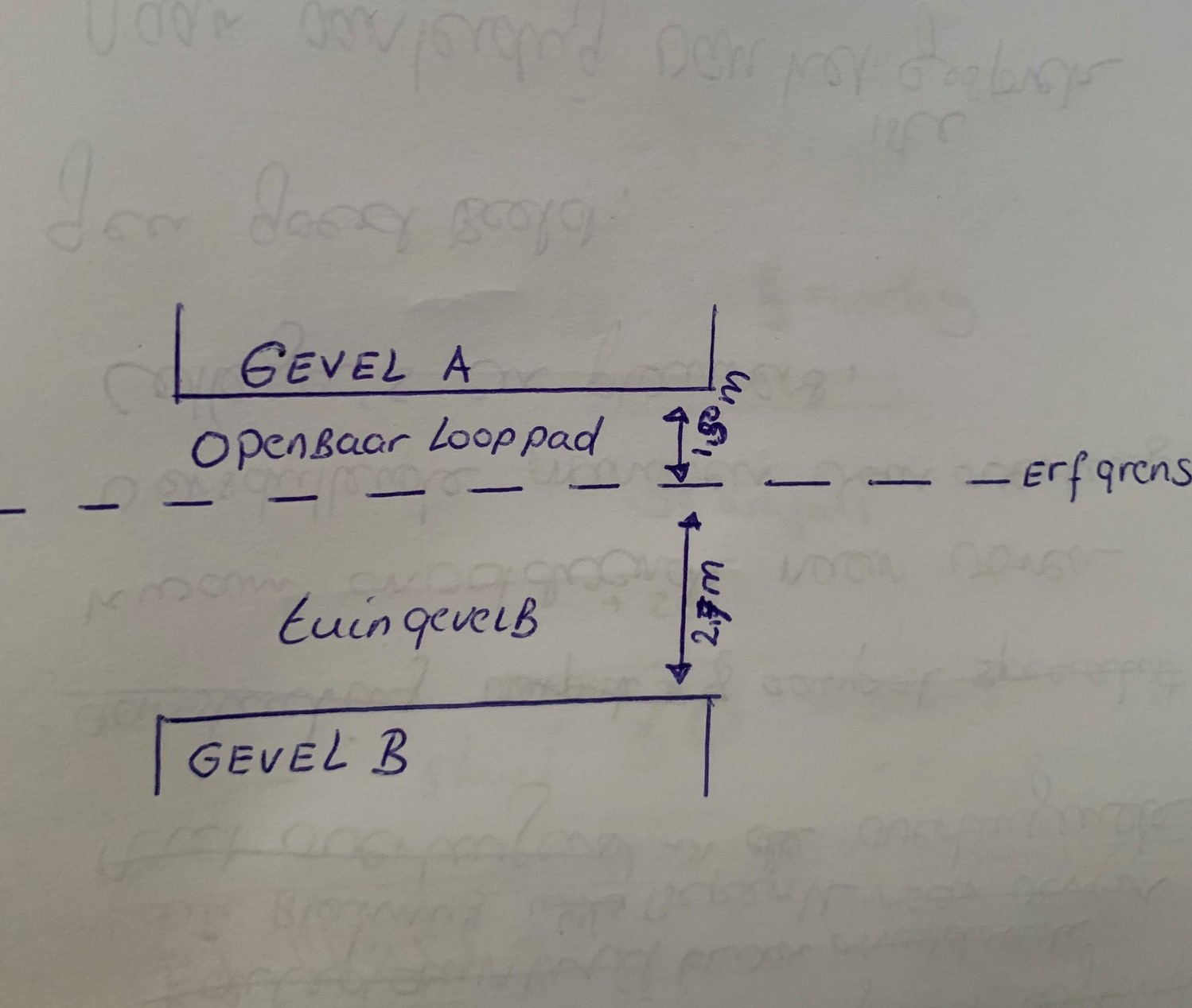De situatie is als volgt: op het naast gelegen perceel (gevel A op de tekening) wordt er een nieuwbouw woning gerealiseerd. De zij-gevel van deze woning staat direct op de erfgrens, direct daaraan verbonden is een openbaar looppad van 1,5 meter breed, aansluitend daaraan is mijn erfgrens en 2,7 meter van mijn erfgrens staat mijn woning/gevel (gevel B op de tekening). Nu zie ik dat er in gevel A op zo'n 4 en 6 meter hoogte 4 grote 60x160 draai/ kiep ramen(doorzichtig) zijn geplaatst. Mijn vraag is dus of dit is toegestaan i.v.m. privacy en brandveiligheid. De totale afstand glas(gevel A) naar gevel B is 4,35 meter.