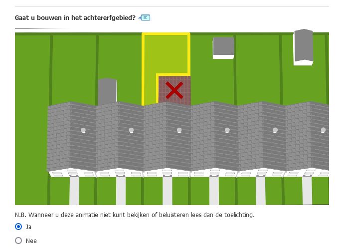 De uitbouw is een jaar of 10 geleden aangebouwd een een rijtjeswoning van ca. 1900. Maar die voldoet niet meer aan de wensen van de opdrachtgever. Volgens de vergunningscheck is het geen achtererfgebied, zie plaatje.