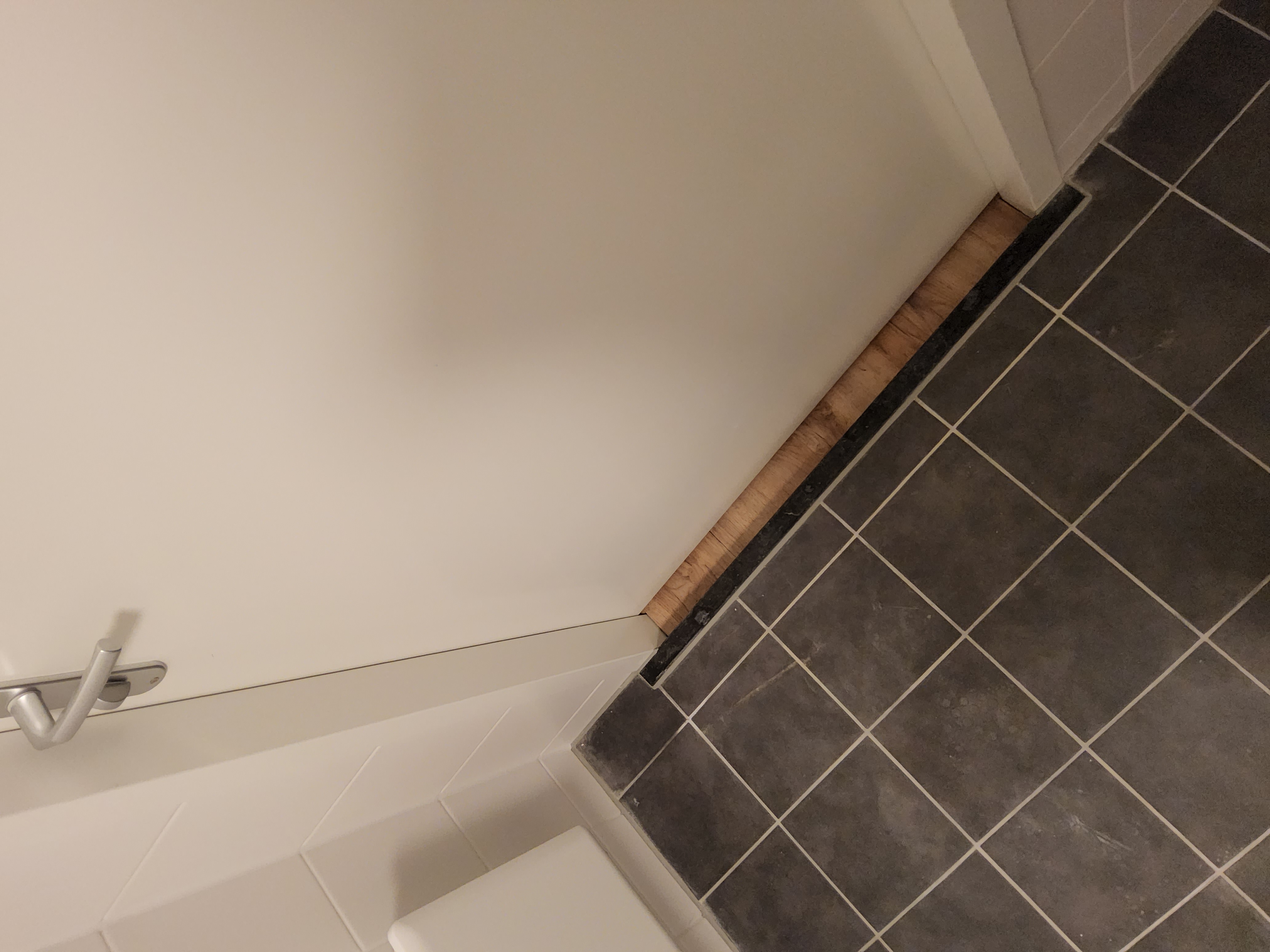 Me dunkt dat als de drempel niet in de badkamer ruimte zou liggen, maar netjes als een dorpel tussen de kozijnen, dar ik van dit effect af ben.